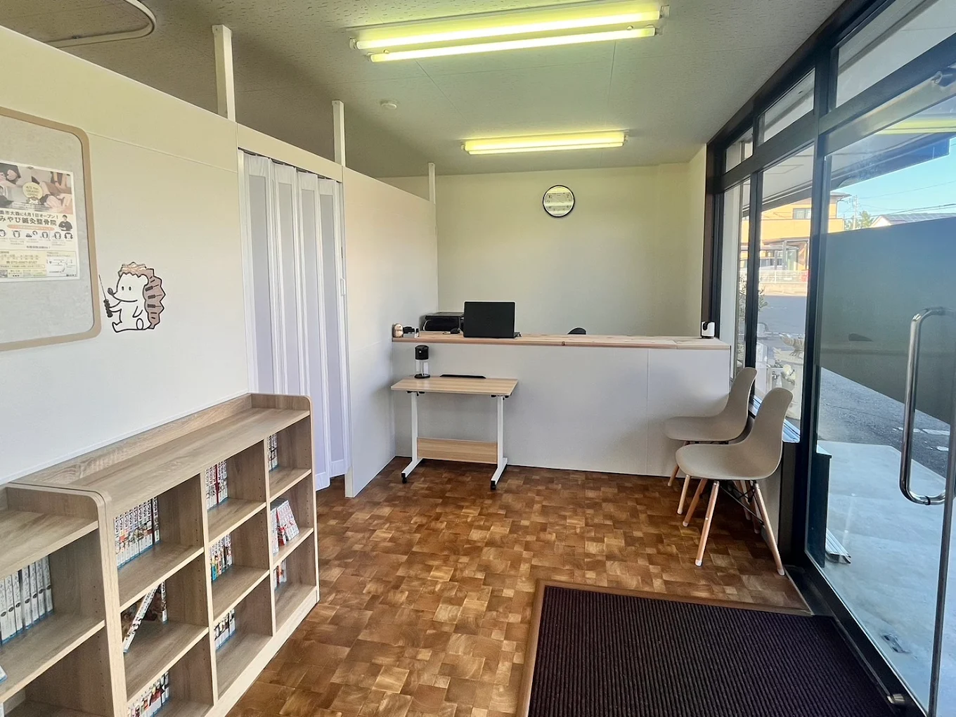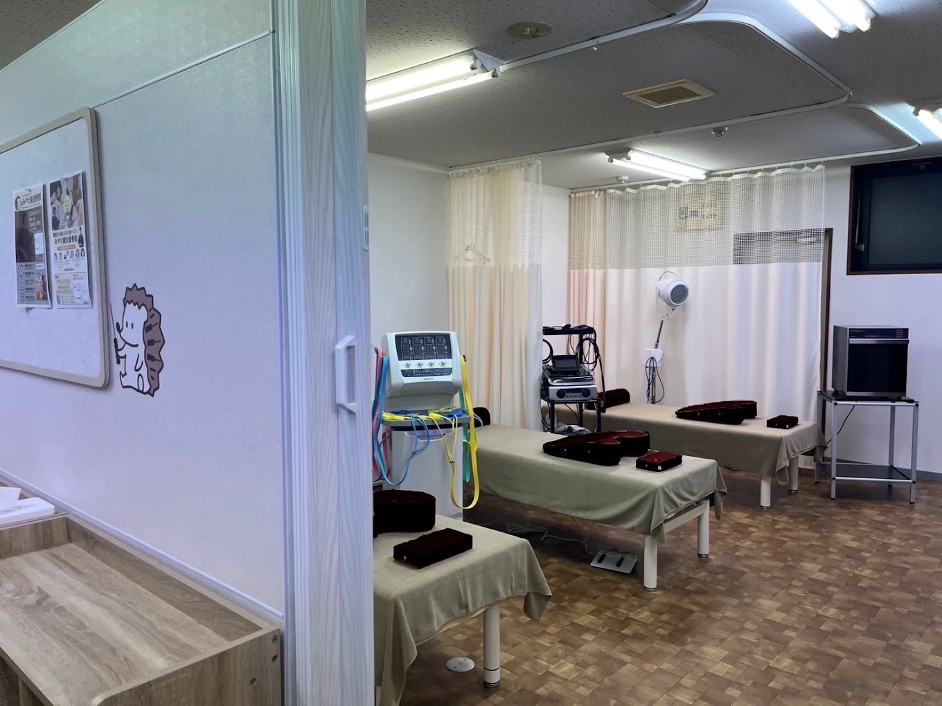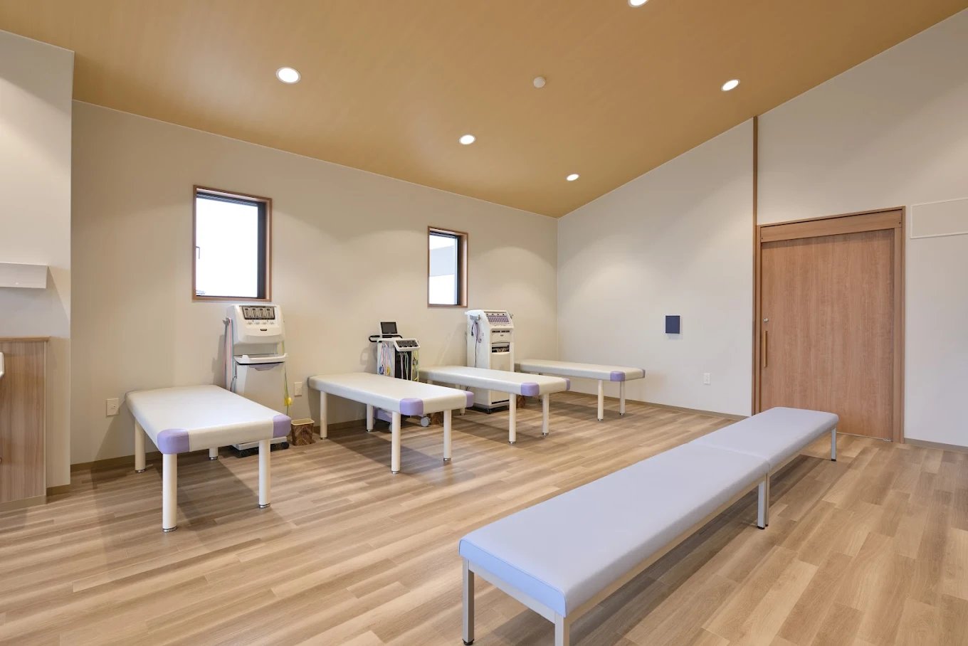 新しく綺麗な院内で広々としたリハビリルームがあり、リラックスして過ごせる