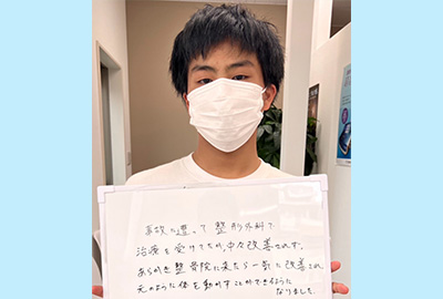 T.S/男性/30代事故治療で通っています。先生方も皆さん話やすく親身になって話を聞いてくれます。一回ごとに良くなって変化があるので、今後も続けて通いたいと思います。
