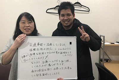 A.G/女性/20代こちらのサイトで見つけて通院。保険のことも手続きまで全て教えてもらえて、安心して治療に専念できます。交通事故でどこに行くか迷っている人におすすめです。